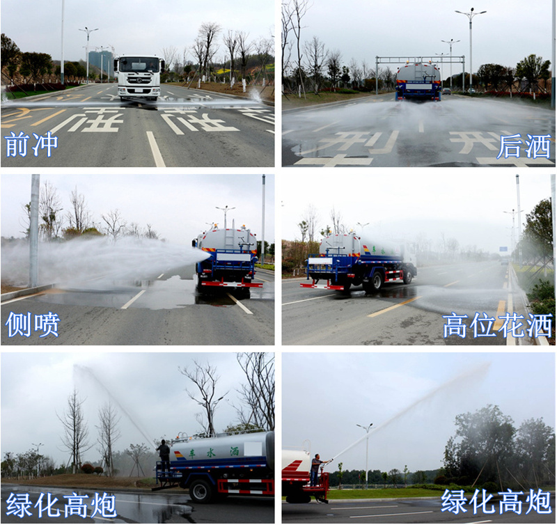 可泵进泵出。消防栓接口,前冲、后洒、侧喷,带后工作平台及绿化高炮,两根等长输水管,带洒水车音乐喇叭,其余标配。 单位使用可选装led灯等个性化附件。本款洒水车均带免征公告,上牌时可免交购置税。